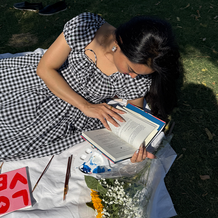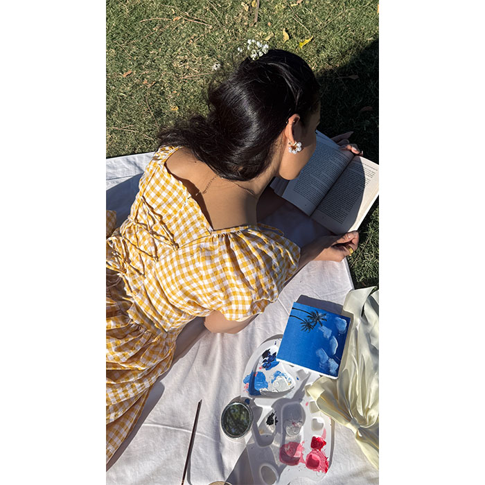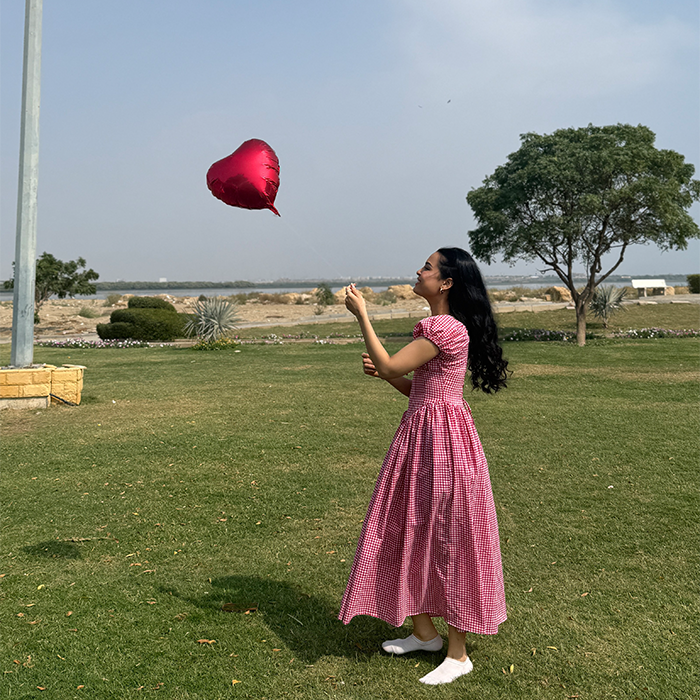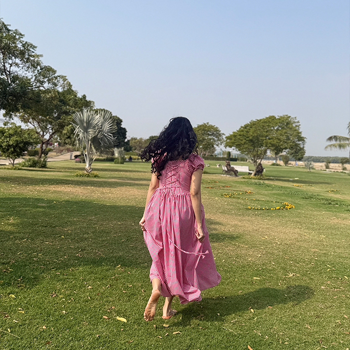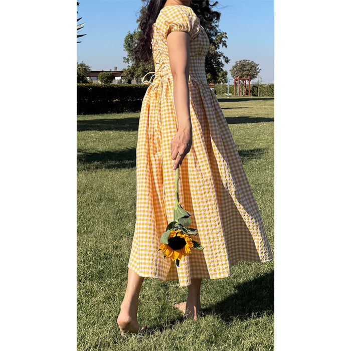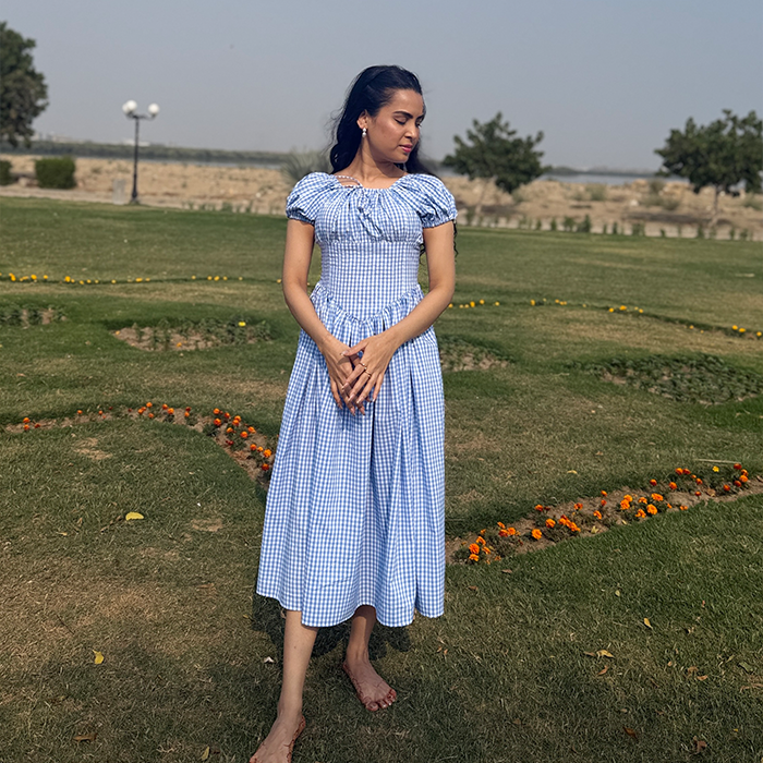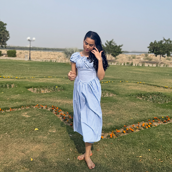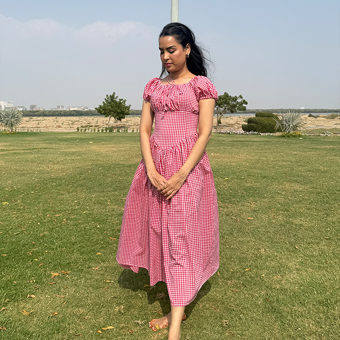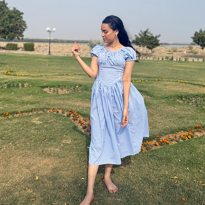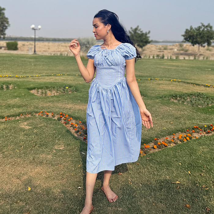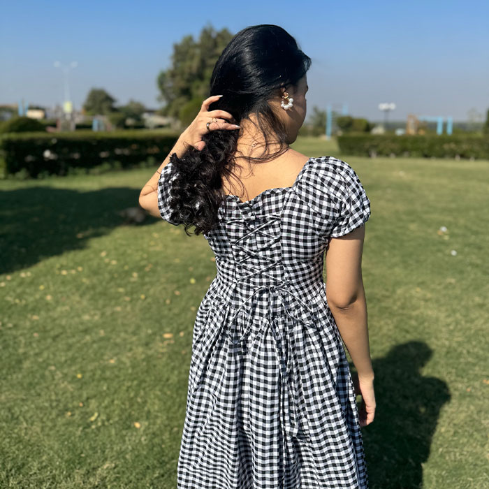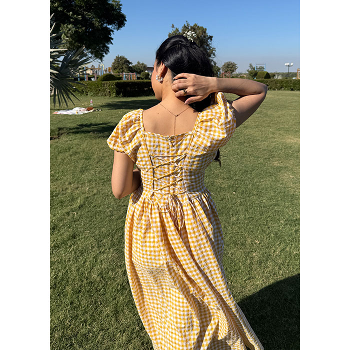 A charming gingham frock featuring a fitted bodice, puff sleeves, and a flowy silhouette for a feminine look. Designed with a laceup back detail that adds a delicate, vintage inspired touch. Perfect for picnics, brunch dates, and sunny day outings.